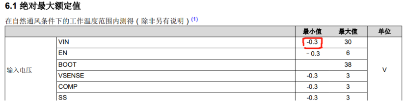 在充電IC手冊中,相信大多數伙伴都有留意到,有幾項極限參數,其中有一項,VIN最小電壓值,一般只有-0.3V左右,如下表。